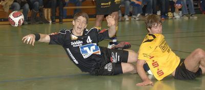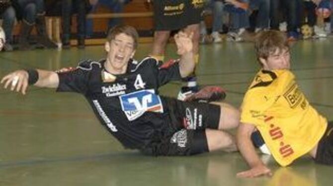 Voller Körpereinsatz: TVN-Kreisläufer Julius Emrich (links) setzt sich vor dem Tor durch.