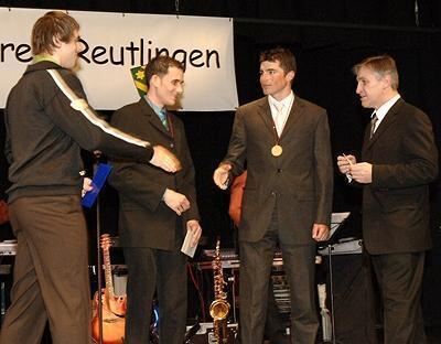 Alte Hasen bei der Sportlerehrung: Michael Göhner und Timo Zeiler mit Neuling Tim Kneule und Karl-Heinz Walter (von rechts).