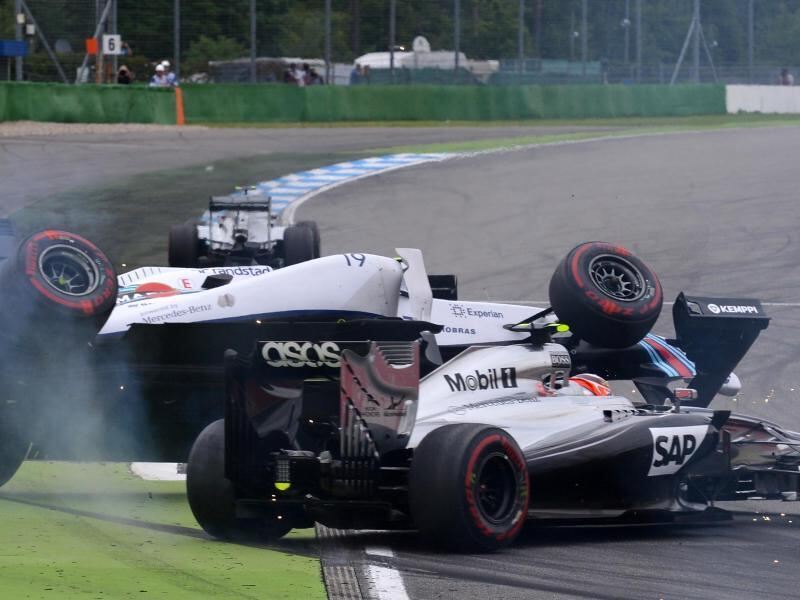 Der Williams von Felipe Massa (oben) überschlägt sich nach einem Unfall mit Kevin Magnussen (r) von McLaren Mercedes. Foto: David Ebener