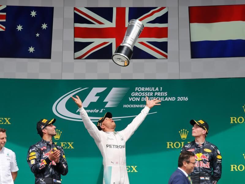 Lewis Hamilton (m.), Daniel Ricciardo (2.vl) und Max Verstappen bei der Siegerehrung. Foto: Ronald Wittek