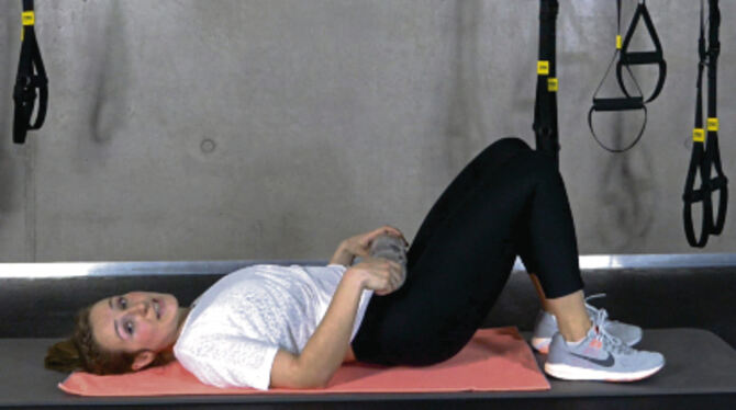 Schwierigkeitsgrad erhöhen: Jeweils ein Bein anheben und dieses parallel zum anderen Bein heben und senken. Zudem können auf die Hüften auch eine Flasche oder kleine Hanteln platziert werden.