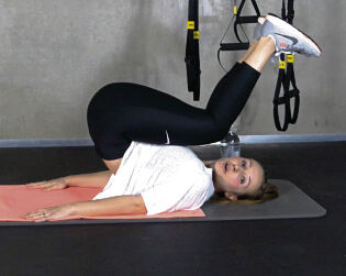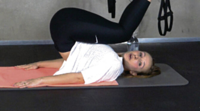 Ausführung: Ausgangsposition ist die Rückenlage auf der Matte mit aufgestellten Beinen. Nun das Becken nach oben schieben und anschließend wieder so weit senken, dass der Po knapp über dem Boden bleibt, also nicht absetzen.