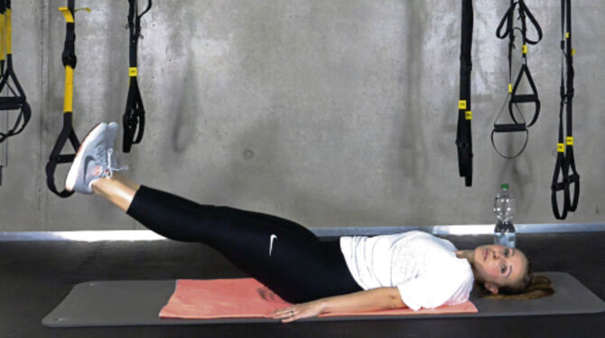 Schwierigkeitsgrad erhöhen: Je dichter die Beine über dem Boden ausgestreckt werden, desto anstrengender ist die Übung. Nur so tief gehen, dass der untere Rücken Kontakt zur Matte hält.