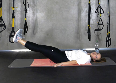 Schwierigkeitsgrad erhöhen: Das obere Bein vom Boden lösen, anschließend heben und senken.
