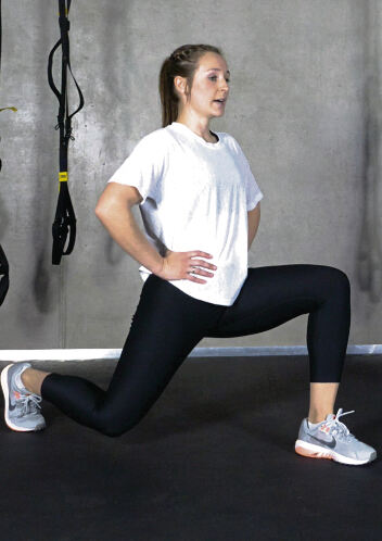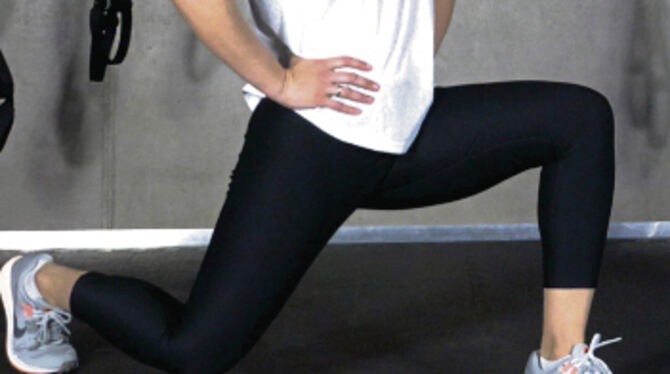 Ausführung: Ausgangsposition ist ein hüftbreiter Stand, die Hände locker in die Hüften gestemmt. Nun erst das rechte Bein mit einem großen Schritt nach vorne setzen und in einen tiefen Ausfallschritt beugen. Wichtig: Das Knie nicht über das Fußgelenk nach vorne herausschieben, sondern immer darüber bleiben. Mit Kraft abdrücken und wieder in die Ausgangsposition kommen. Danach das linke Bein vorsetzen und die Übung wiederholen.