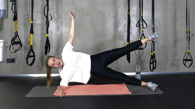 Ausführung: Seitliche Lage auf der Matte, rechten Ellenbogen unter der Schulter platzieren, Beine ausstrecken. Dann nach oben drücken, den Körper in einer Linie halten, linken Arm in die Höhe strecken. Achtung: Becken nach vorne und oben schieben. Dann Übung auf anderer Seite (linker Ellenbogen auf Matte) machen.