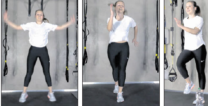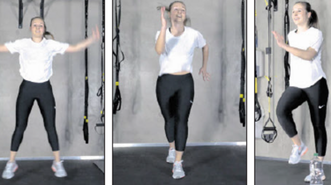 Von links: 30 Hampelmänner, 30 Wechselsprünge (Beine vor und zurück), Eine Minute Skippings (Knie nach oben ziehen).