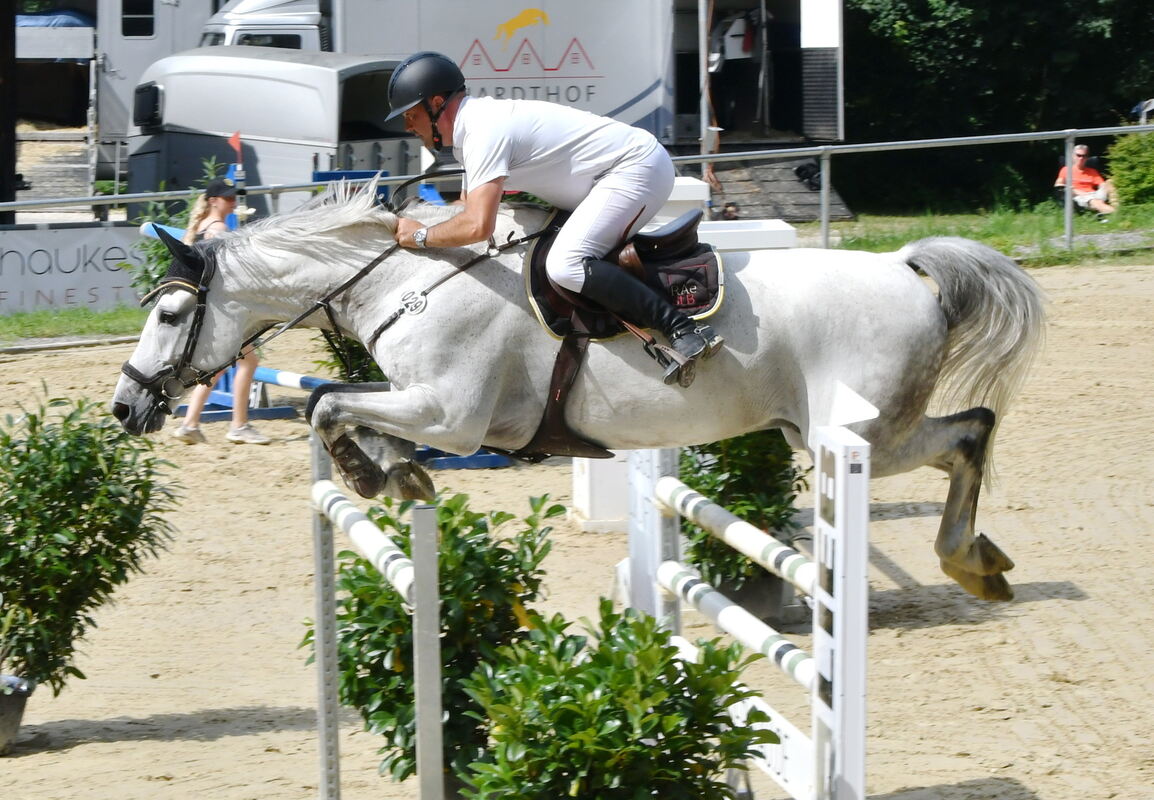 Constantin Sorg vom RFV Fronhofen siegte im abschließenden S-Springen des von der Reiterkameradschaft Pfullingen veranstalteten Turniers am Ahlsberg. FOTO: MEYER