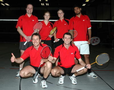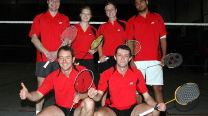 Die Badminton-Asse der SG Metzingen/Tübingen. Obere Reihe (von links): Jochen Gaißer, Miriam Kümmel, Verena Kiefer, Joem Joselal; unten: Kai Görz, Ralf Ortinau.