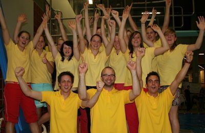Die Frauen-Mannschaft der SSG Reutlingen/Tübingen freut sich über den Aufstieg in die zweite Bundesliga. Von links: Marie-Louise Rex, Carolina Strubel, Susan Jehne, Maren Reinhardt, Lisa Holzäpfel, Svenja Gerstenberger, Carina Wahr, Annika Priewe, Julia Thieringer, Sina Hoch, Verena Wagner, Marie-Charlotte Rosahl; vorne von links: Die Trainer und Betreuer Steffen Amann, Jörg Hünecke, Nico Moritz.