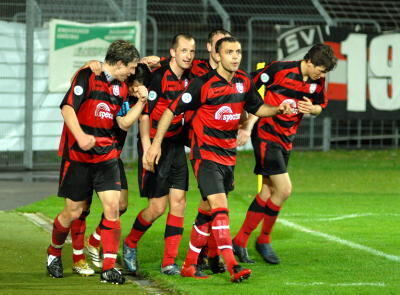 Reutlinger Tor-Jubel: Von links Lars Heller, der zweifache Torschütze Denis Lapaczinski und Innenverteidiger Ivan Cosic.