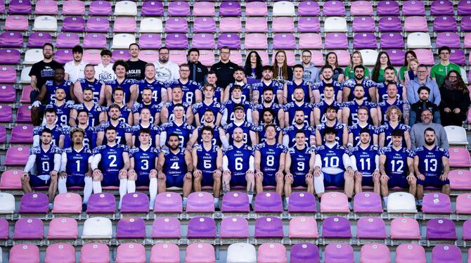 Das Eeagles-Team der Regionalliga-Saison 2025, erste Reihe (unten) von links: Leander Winter, Nelson Stegmaier, Carl Sigloch, Jannick Müller, Abiddine Makhloufi, Nils Wortmann, Nicolas Schwab, Mike Danowski, Kai Singer, Tommy Möschter (Abgang Ravensburg Razorbacks II), Johannes Kohler, Marcel von Lipinski, Cengiz Arslan. Zweite Reihe: Timo Golez, Lukas Rometsch, Michael Kurz, Simon Schal, Pascal Schmitt, Elian Porreca, Lucas Gollmer, Kerem Sarac, Pascal Schneider, Isaias Tsarnos, Mathis Leonhardt, Malik Geider, Burkhard Kurz (Vorstand. Dritte Reihe: Marvin Zweig, Tobias Reinhardt, Niclas Löschner, Lutz Schneider, Luis List, Yannic Buchwalder, Niclas Hühnergarth, Patrick Brenzel, Felix Gerdes, Bastian Moryson, Felix Cardinal von Widdern, Tobias Stocker, Christoph Trybek (Kassier). Vierte Reihe: Emanuell Callsen, Stefan Gaiser, Franz Schneider, Leon Häbich, Jonas Link, Michael Kramm, Nathan Boeck, Mick Weyrich, Marc Leipprand, Tarik Arslan, Alan Ali, Samuel Wellbrink, Oliver Kurz (Vorstand), Esther Rometsch (Fotografin). Fünfte Reihe: Sven Götz (Merchandising), Daniel Hoch (Marketing), Liam Schyja (Offense Assistant), Philipp Schiweck (Offensive Coordinator), Michael Häring (Head Coach), Oliver Horn (Running Back Coach), Dennis Irowetz (Defensive Line Coach), Almina Kiltan (Social Media), Lisa Dolzer (Physiotherapeutin), Simon Bauer (Stadionsprecher), Lisa Cardinal von Widdern (Teammanagerin), Ellen Grebenstein (Gameday Managerin), Clara Cuzma (Eventmanagerin), Vanessa Gaiser (Gameday), Oliver Braunstein (Technik). Auf dem Bild fehlen: John Harris, Leo Dumke, Maximilian Hoffmann, Marc Kuppinger, Albion Kraki, Michael Okafor, Justis Iduseri, Kai Dingler, Marc Seefeldt, Darren Brown, Kai Krauss, Christian Nesic, Domenico Streich (alle Spieler), Kevin de Lenardis (Offensive Line Coach), Magnus Bumiller (Wide Receiver Coach), Daniel Arends (Line Backer Coach), Marco Steinbach (Line Backer Coach), Lukas Grampp (Defense Assistant), Christian Rothweiler (Line Backer Coach), Sarrow Drammeh (Defensive Back Coach).