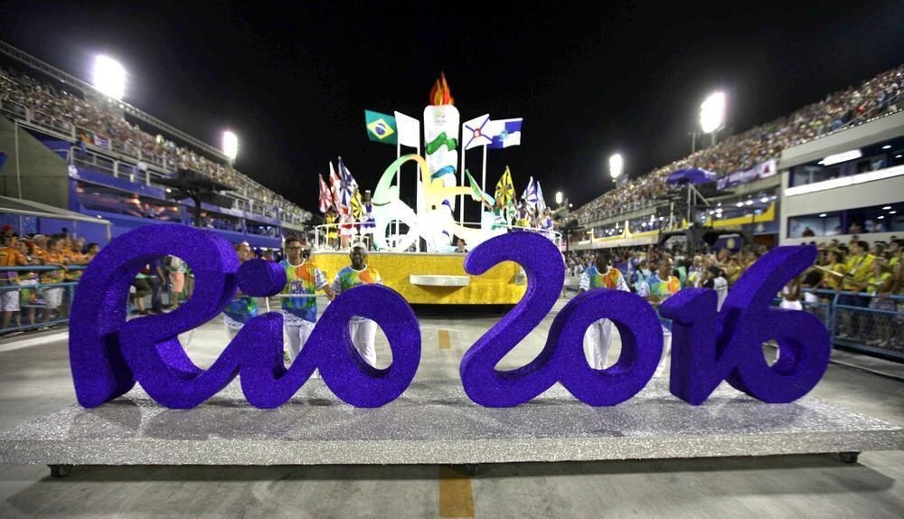Das Logo der Olympischen Spiele auf einer Sambaparade in Rio.