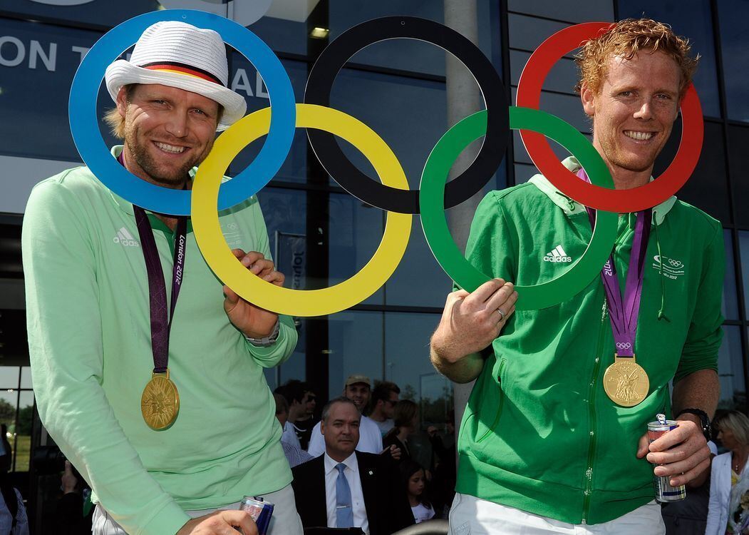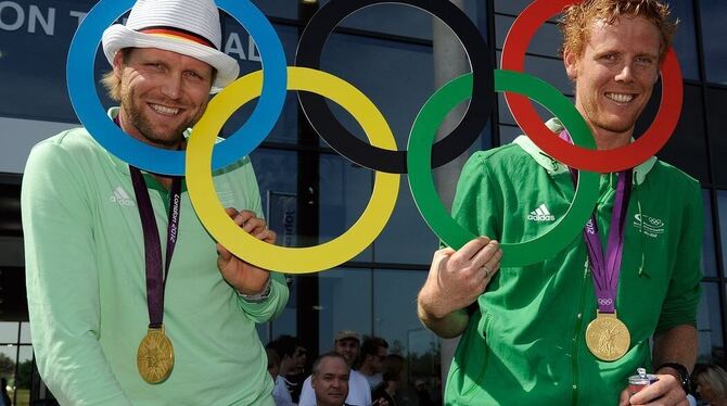 Um keinen Spaß verlegen: Die Beachvolleyball-Olympiasieger Julius Brink (links) und Jonas Reckermann. FOTO: DPA
