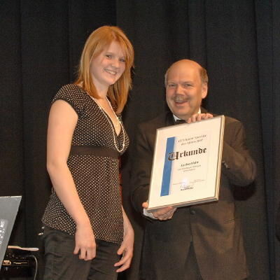 Hoch talentiert: Valdo Lehari jr. ehrt Carina Wahr mit dem GEA-Junior-Preis.