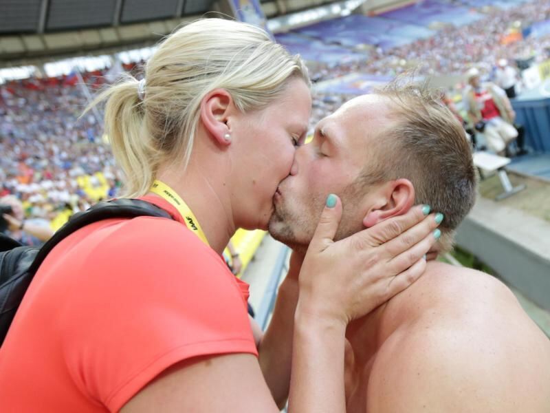 Diskus-Weltmeister Robert Harting knutscht nach seinem Sieg mit Freundin Julia Fischer. Foto: Michael Kappeler