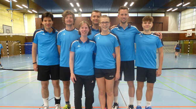 Die TuS Metzingen steigt in die Badminton-Baden-Württembergliga auf. Hinten von links: Bastian Löffler, Stefan Single, Ralf Ortinau, Frank Hagemeister, Benedikt Tausch; vorne von links: Stefanie Matt, Simone Möhrle. FOTO: SCHELLIG