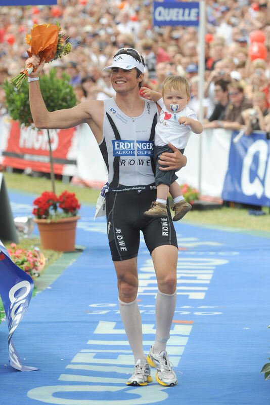 Der Moment des größten Erfolges: 2009 hat Michael Göhner den legendären Langdistanz-Triathlon von Roth gewonnen. Auf seinem Arm Sohnemann Max. foto: dpa