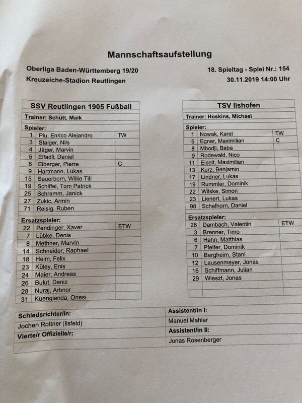 Halbzeit: Der SSV Reutlingen tut sich spielerisch schwer, hätte aber trotzdem in Führung gehen können, wenn sie die im Ansatz durchaus guten Chancen besser ausgespielt hätte. Die beste vergab Ruben Reisig (42. Minute), der mit seinem Schuss an der Latte scheiterte. Ilshofen präsentiert sich gut, hält aggressiv dagegen. Für drei Punkte muss der SSV noch eine Schippe drauflegen.