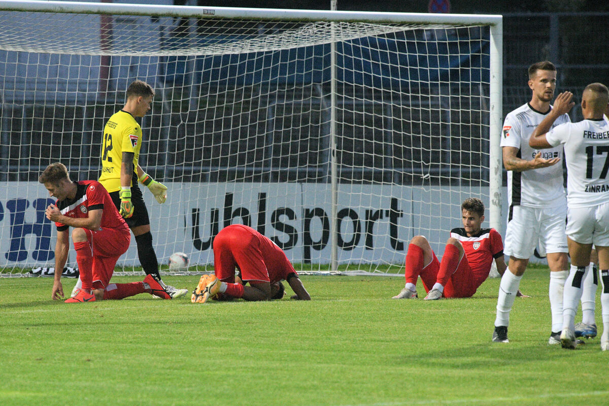 90. Minute + 3 Freibergs Kapitän Grüttner bleibt ab Boden liegen und nimmt so etwas Zeit von der Uhr.