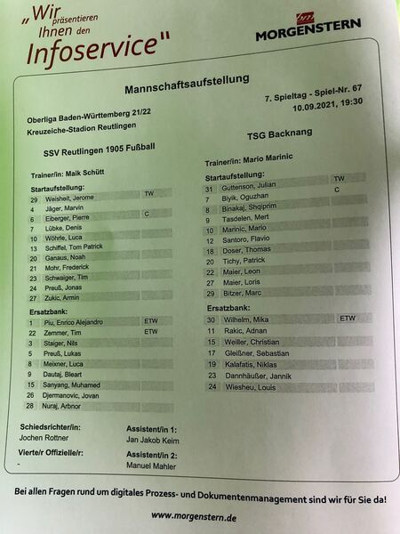 Halbzeit Zum Schluss der ersten Halbzeit wurde es in einem bis dahin faden Spiel doch noch einmal spannend. Fast hätte Ganaus den SSV aus dem Nichts in Führung geschossen, doch er scheiterte an der Latte. So geht es mit einem leistungsgerechten 0:0 in die Kabinen. Die Reutlinger müssen sich deutlich steigern, wenn sie den ersten Heimsieg der Saison einfahren wollen.