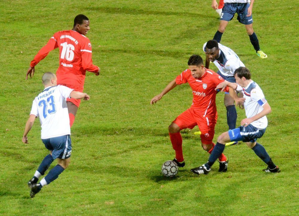 Typische Szene: Tevfik Altindag (am Ball) wird von zwei Mannheimern attackiert. Links stürmt ein dritter heran. FOTO: NIETHAMMER