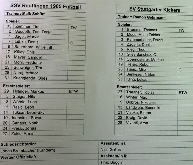 Halbzeit Der SSV Reutlingen geht mit einem 0:1-Rückstand gegen die Stuttgarter Kickers in die Pause. Der Außenseiter hat sich bisher gut verkauft im Derby, eine der wenigen Nachlässigkeiten in der ansonsten stabilen Defensive hat zum Gegentor durch Giles (25. Minute) geführt. Nach vorne fehlt den Reutlinger noch die Durchschlagskraft. Aber wenn die Gastgeber im zweiten Durchgang etwas mutiger auftreten, ist gegen den Tabellenzweiten noch etwas drin.