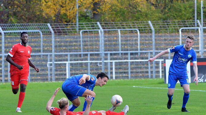 REUTLINGEN. Der SSV Reutlingen hat das Oberliga-Derby gegen die Stuttgarter Kickers mit 0:3 (0:1) vor 460 Zuschauern im ausverkauften Kreuzeiche-Stadion verloren. Die Gastgeber haben zwar gekämpft, trotzdem fehlte über 90 Minuten der Mut, der Qualität des Tabellenzweiten offensiv etwas entgegenzusetzen. Der Ex-Reutlinger Christian Giles (25. Minute) nutzte im ersten Durchgang eine Nachlässigkeit in der SSV-Defensive, um die Kickers auf die Siegerstraße zu bringen. Im zweiten Durchgang erhöhten die Kickers zu Beginn die Schlagzahl, Mijo Tunjic erhöhte in der 51. Minute auf 2:0 für die Gäste. Der SSV spielte danach mutig auf den Anschlusstreffer, schaffte es aber nicht, gute Chancen zu erspielen. Es fehlte an Durchschlagskraft. Nur in der 71. Minute zappelte der Ball im Netz, aber Arbnor Nuraj stand bei seinem Treffer nach einem Freistoß von Schwaiger wohl knapp im Abseits. Stattdessen sorgte David Kammerbauer (84.) für die Entscheidung. Anders als zuletzt häufig, war es auch Corona-bedingt ein ruhiges Derby. Auf dem Platz ging es zwar manchmal etwas härter zur Sache, aber nie unfair. Auch auf den Rängen und rund um das Stadion blieb es ruhig.