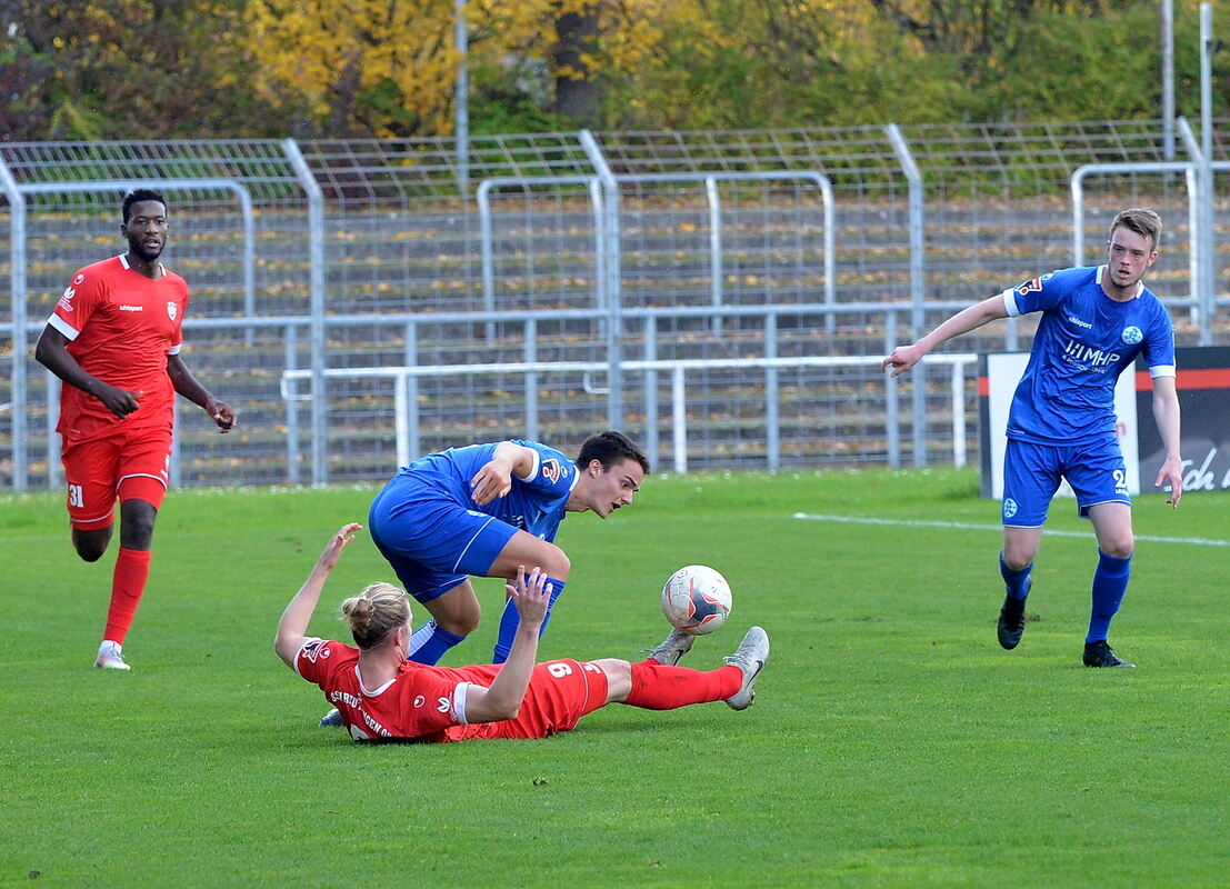 33. Minute Kickers-Verteidiger Rieg bleibt im eigenen Strafraum liegen. Er muss behandelt werden. Es sieht so aus also würde es bei ihm nicht weitergehen.