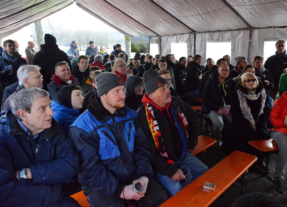 Die Fans stehen während des Spiels hinter der Haupttribüne unter einem kleinen Zelt dicht an dicht. Sie verfolgen das Spiel im Livestream auf zwei Fernsehern bei einem Public Viewing, das die Szene E organisiert hat. Wer allerdings keinen Platz in einer der vorderen Reihen ergattert hat, sieht nicht viel. Weil die Bildqualität mau ist, sind die Spieler kaum zu erkennen. Wie es steht, wissen viele auch nach Schlusspfiff noch nicht, weil im Livestream fälschlicherweise immer 0:0 als Ergebnis eingeblendet ist. Viele interessiert das Spielgeschehen aber auch nur am Rande, sie stehen oder sitzen in Grüppchen zusammen, plaudern fröhlich. Sie unterstützen ihren SSV lieber, indem sie essen, trinken und Geisterspiel-Tickets kaufen. Denn alle Einnahmen kommen dem Verein zugute.