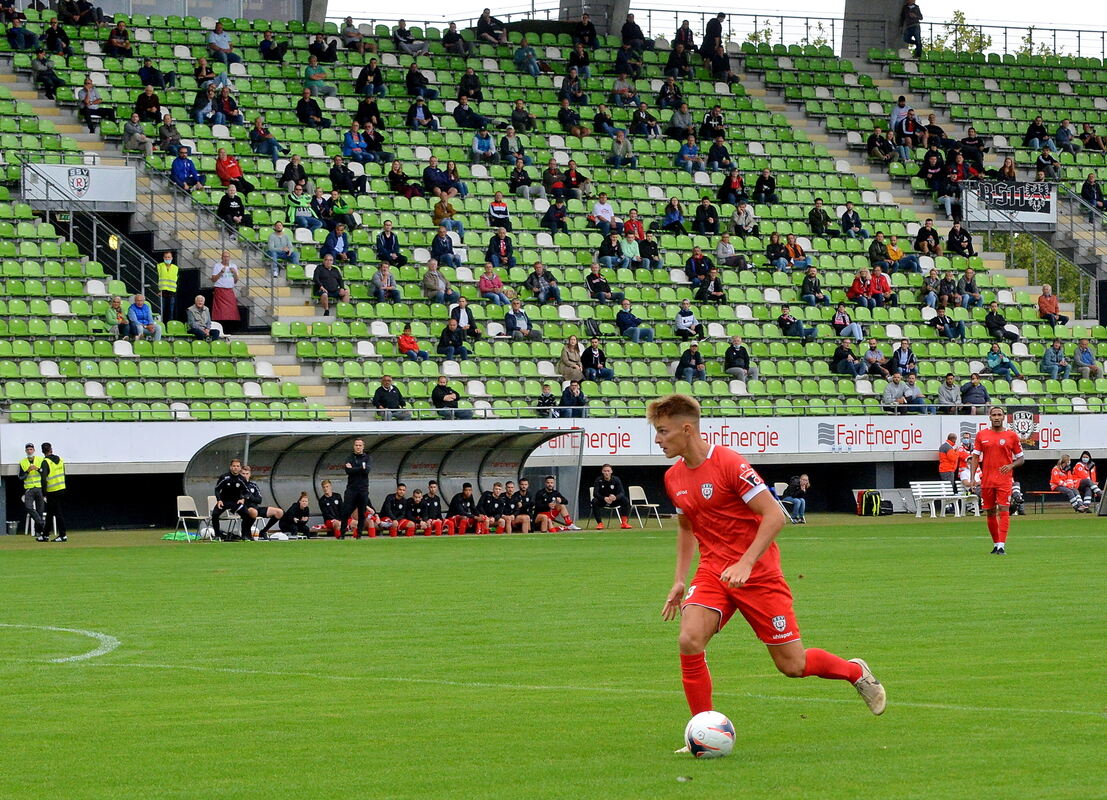 Am Ball: Tim Schwaiger vom SSV Reutlinger in der Saison 2020/21 vor 460 zugelassenen Zuschauern im Kreuzeiche-Stadion in Reutlingen.