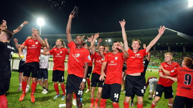 Riesenfreude bei den SSV-Spielern nach dem Sieg über den Karlsruher SC.
