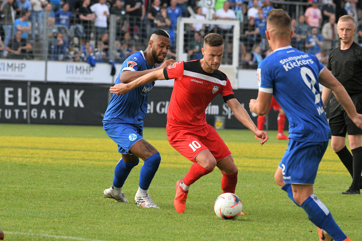 Luca Wöhrle (Mitte) vom SSV Reutlingen im Spiel gegen die Stuttgarter Kickers.