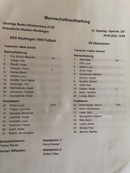Bilanz. Mit Freude dürften die SSV-Fans an das Hinspiel im August in Oberachern zurückdenken. Damals gewannen die Reutlinger dank einer starken zweiten Halbzeit mit 4:1. Auch insgesamt ist die Pflichtspiel-Bilanz positiv. Von den vergangenen 13 Duellen ging der SSV fünfmal als Sieger vom Platz, dreimal gewann Oberachern. Fünf Partien endeten Remis. Ein weiterer Hoffnungsträger für die Reutlinger ist Onesi Kuengienda. Der Stürmer hat schon fünfmal gegen den heutigen Gast getroffen, letztmals im Hinspiel.