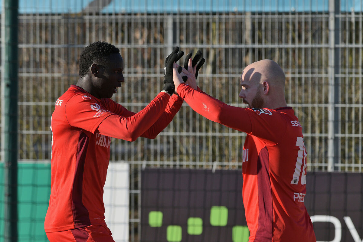 Jubel beim SSV Reutlingen: Sidy Niang (links) trifft per Kopf zum 2:0, Dirk Prediger (rechts) ist der Flankengeber. FOTO: BAUR
