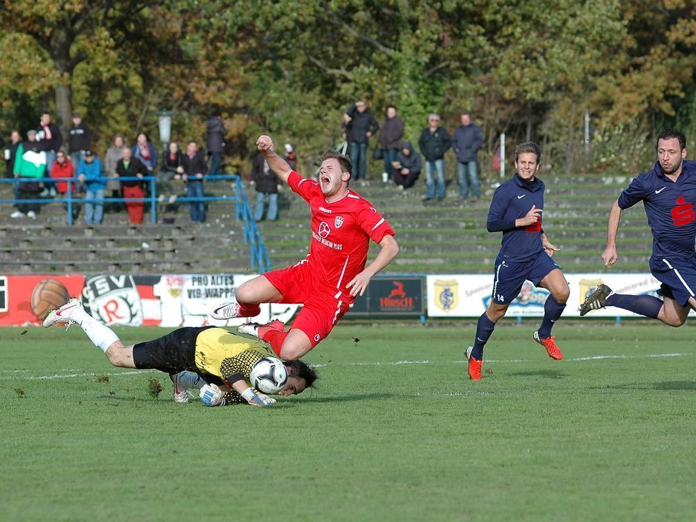 Marcel Brandstetter vom SSV wird von Singens Torhüter Selcuk Turan gefoult. Klare Sache: Strafstoß für Reutlingen. FOTO: BAUR