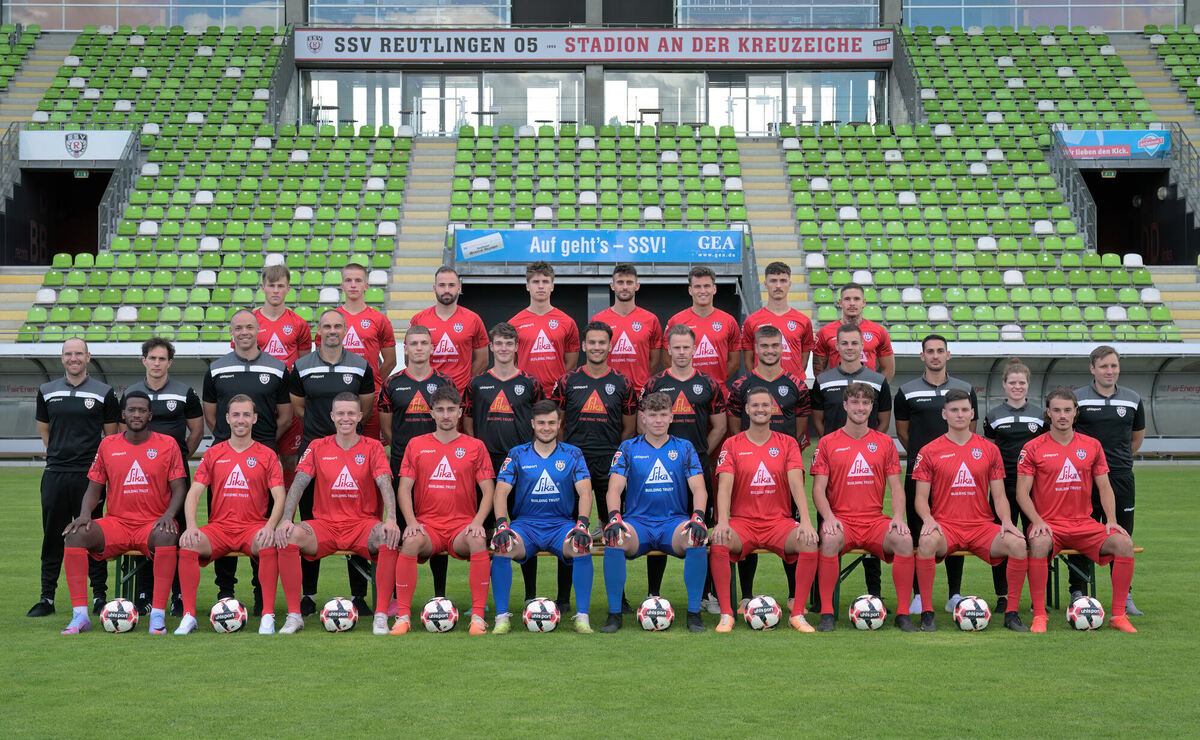 Mit diesem Aufgebot geht der SSV Reutlingen in die Fußball-Oberliga-Saison 2023/24. Hintere Reihe von links: Ole Deininger, Florian Krajinovic, Luca Plattenhardt, Luca Meixner, Riccardo Gorgoglione, Tom Schiffel, Jonah Adrovic, Daniel Sanchez; mittlere Reihe von links: 2. Vorsitzender Christian Grießer, Torwarttrainer Matthias Wucherer, Mannschaftsarzt Mickel Washington, Torwartrainer Stefan Kuchelmeister, Roman Kasiar, Kevin Founes, Vladan Djermanovic, Denis Lübke, Stefan Ilic, Co-Trainer Jack Luz, Co-Trainer Ferhat Findik, Physiotherapeutin Madita Habermehl, Trainer Maik Stingel; vordere Reihe von links: Onesi Kuengienda, Mattia Trianni, Marco Gaiser, Mirhan Inan, Enrico Piu, Louis Potye, Marvin Jäger, Ben Schaal, Aaron Leyhr, Nils Staiger.