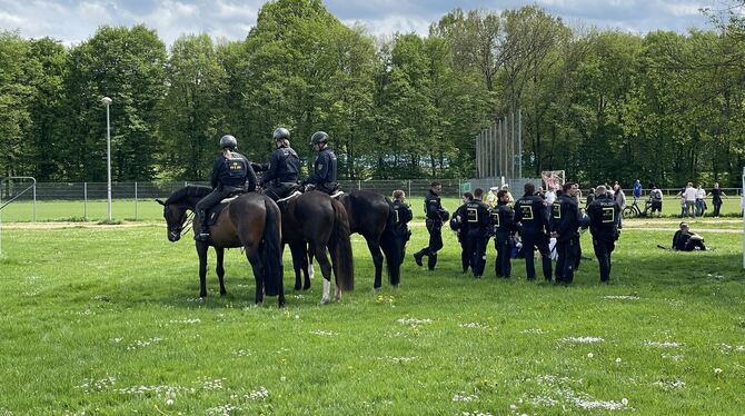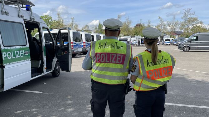 Polizeipräsenz. Da das Duell gegen die Stuttgarter Kickers als Hochrisikospiel eingestuft ist, wimmelt es im Umfeld des Kreuzeichestadions von Polizisten. Auf dem Verkehrsübungsplatz parken dutzende blauweiße Wagen, auf den Fußballplätzen am Markwasen patrouillieren Beamte in voller Schutzkleidung. Mit wie vielen Einsatzkräften die Polizei vor Ort ist, sagt die Pressestelle vorab nicht. Nur so viel: Beamte der Polizei Reutlingen, des Polizeipräsidiums Einsatz sowie Reiterstaffel und Polizeihundeführerstaffel sind im Einsatz. Sie sollen dafür sorgen, dass beide Fanlager friedlich miteinander auskommen.