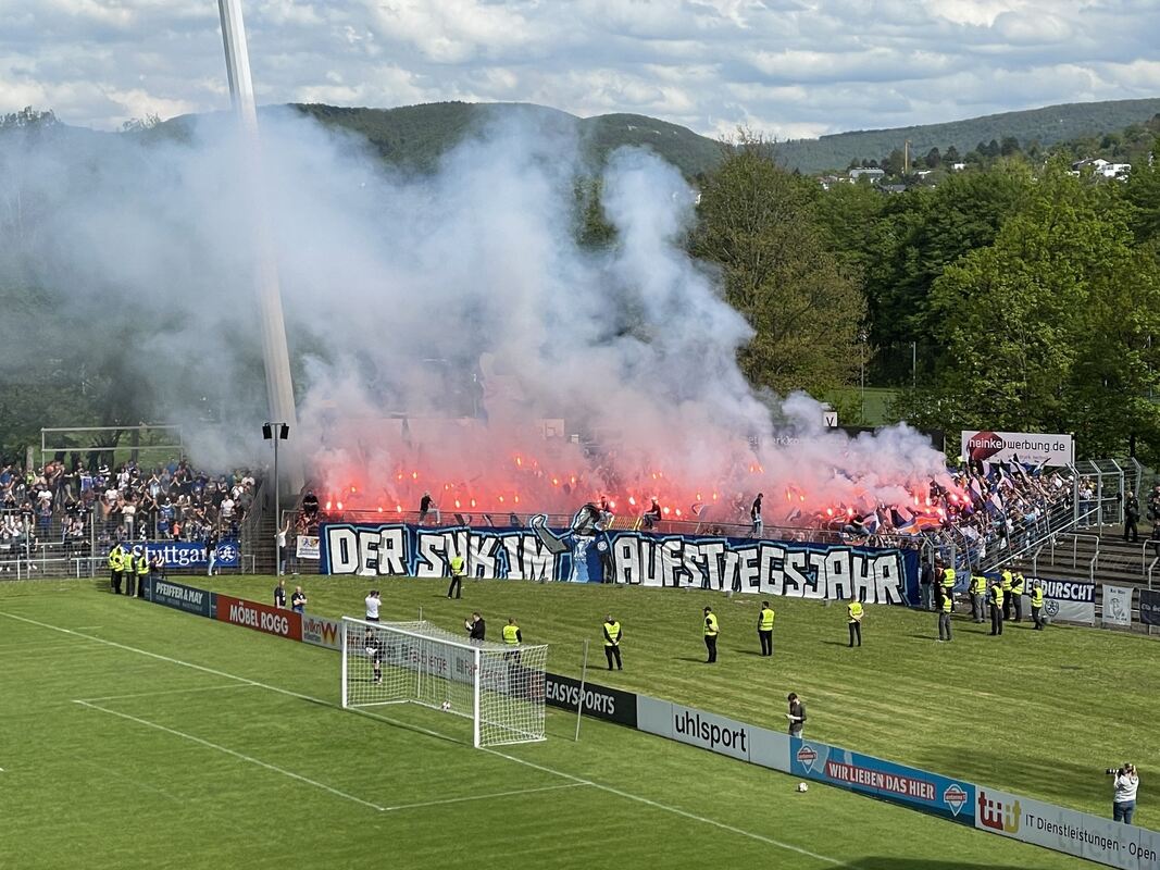 17. Minute Das Spiel ist noch kein Leckerbissen, aber die Stimmung ist schon einzigartig. Eine offizielle Zuschauerzahl liegt zwar noch nicht vor, der SSV geht jedoch von 4.500 bis 5.000 Fans aus. Die sorgen bislang für eine Stimmung wie man sie im Kreuzeichestadion zuletzt im DFB-Pokal gegen den SSV Ulm erlebt hat. Der Kickers-Block ist komplett voll, zu Beginn des Spiels wurde hier Pyrotechnik gezündet.