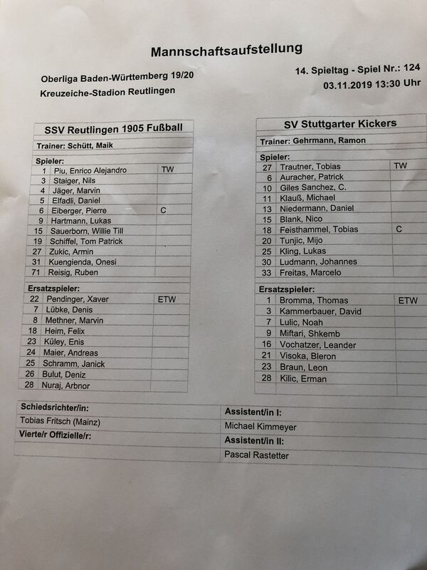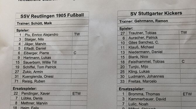 13.15 Uhr: Die Aufstellungen sind da. Auf Seiten der Reutlinger steht mit Marvin Jäger ein Ex-Kicker. In der vergangenen Saison trug er 19 Mal das blaue Trikot in der Oberliga. Bei den Stuttgarter läuft Cristian Giles von Beginn an als Mittelstürmer auf. Der Spanier war in der vergangenen Spielzeit mit 12 Treffern Top-Torschütze des SSV.