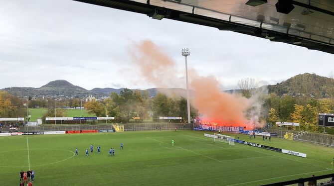 19. Minute: Die Stuttgarter Anhänger feiern die Führung mit Pyrotechnik. Stadionsprecher Wolfgang Gattiker verkündet, dass der Schiedsrichter beide Teams in die Kabinen schicken wird, wenn sie nochmal zündeln.