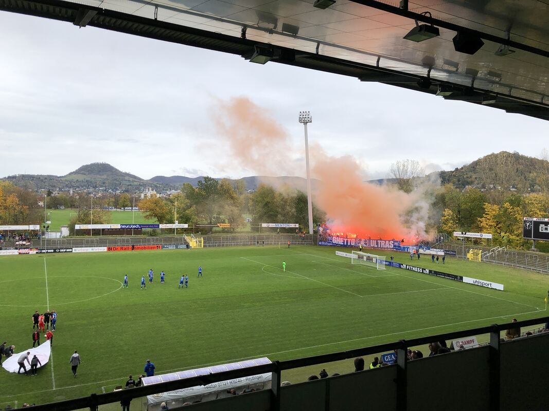 13:32 Uhr: Schiedsrichter Tobias Fritsch wartet noch mit dem Anpfiff weil die Stuttgarter Fans Pyrotechnik in ihrem Block gezündet haben. Das Spielfeld ist benebelt.
