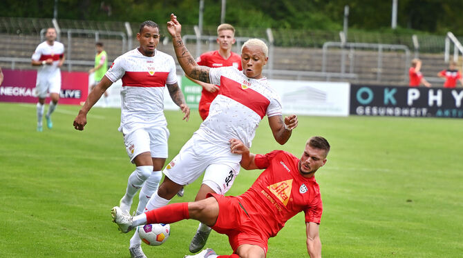 Stefan Ilic (rechts/SSV), der in dieser Szene Roberto Massimo vom VfB Stuttgart stoppt, agiert gegen Offenburg als Abwehrchef der Dreierkette.