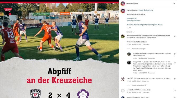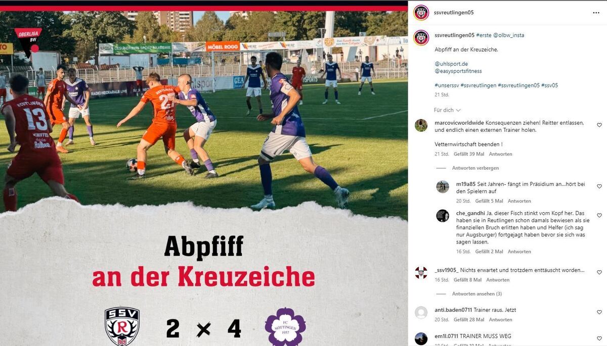 Einig waren sich die frustrierten Fans aber nicht, wer denn jetzt die Schuld hat. Allerdings schienen viele dem Statement »Einige Spieler und Funktionäre des SSV stoßen in der Oberliga hart an ihre Grenzen«, zuzustimmen. 21 Daumen-Hoch-Reaktionen gab es für die Worte. Auf Instagram sahen viele im Coach den Schuldigen, während auf Facebook eher der Verein als Ganzes in der Kritik stand.