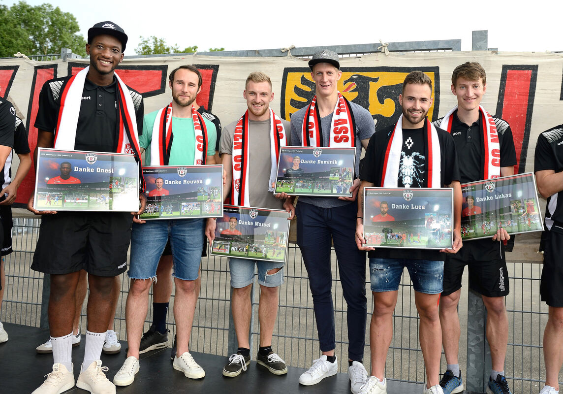 Wurden beim SSV Reutlingen verabschiedet: (von links) Onesi Kuengienda, Rouven Wiesner, Marcel Knauß, Dominik Traub, Luca Plattenhardt und Lukas Hartmann. FOTO: PIETH