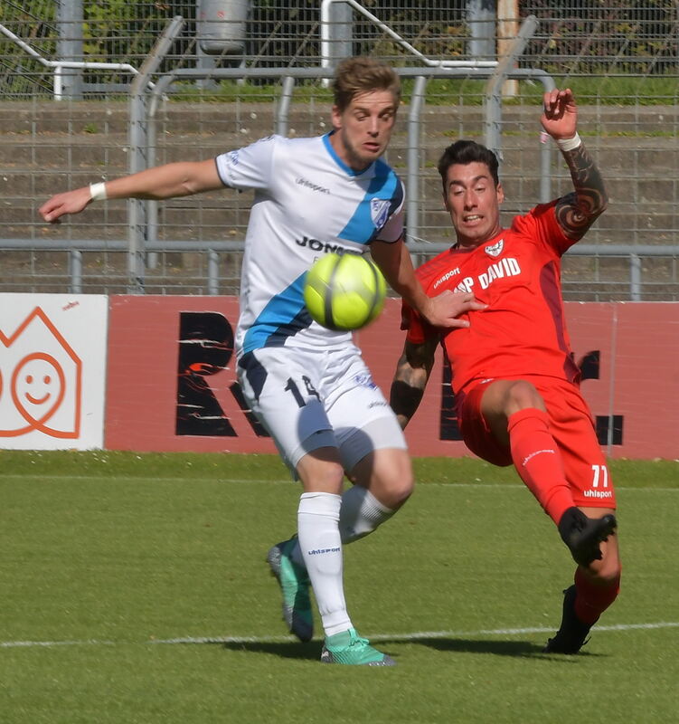 Szene aus dem Vorrundenspiel, das an der Kreuzeiche 1:1 endete: Cristian Giles (rechts) im Zweikampf mit Lukas Buck. Später wurde Giles mit der Roten Karte bedacht. FOTO: MEYER