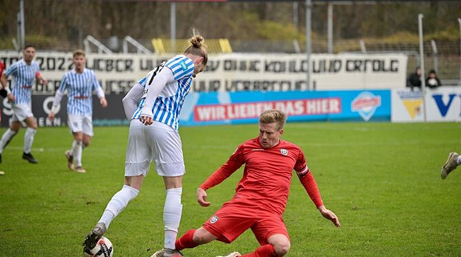 45. Minute Jetzt wird es kurz hitzig: Der Reutlinger Meixner schubst Götz zu Boden, nachdem dieser vom Pforzheimer gefoult worden war. Aber der Schiedsrichter lässt es bei einer Ermahnung für beide.