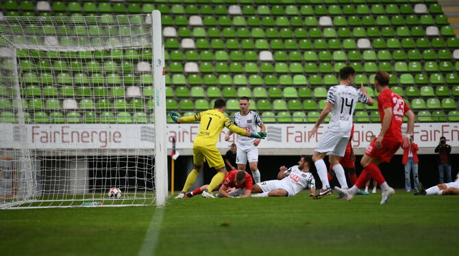 61. Minute Nachdem Piu einen ersten Versuch abwehrt und danach aus dem Tor stürmt, kommt ein Villinger an den Ball und spielt ins Zentrum, dort haut Torjäger Sökler den Ball rein. Bitter.