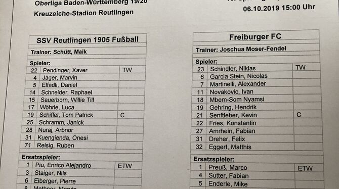 14.45 Uhr: In dieser Saison zeigt der SSV Reutlingen zwei Gesichter. Ordentliche bis gute Auftritte zu Hause im Kreuzeiche-Stadion (zwei Siege, zwei Unentschieden) wechseln sich mit schwachen bis indiskutablen Leistungen wie am in der Fremde (ein Punkt, kein Tor) ab. Am vergangenen Samstag setzte es eine 0:2-Niederlage beim FV Ravensburg. Deshalb hat sich der SSV nach neun Spieltagen im Tabellenkeller eingenistet. Um dort nicht dauerhaft festzusitzen, ist ein Sieg gegen Vorletzten Freiburger FC Pflicht. Die Gäste haben nur das erste Spiel gegen den 1. CfR Pforzheim (2:0) gewonnen und zuletzt fünfmal in Serie den Platz als Verlierer verlassen.