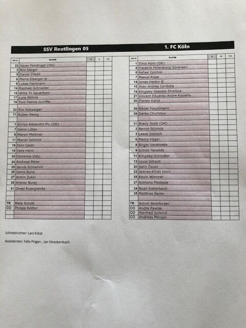 13:25 Uhr: In den Reihen der Kölner sind einige ehemalige SSV-Aktuere. Allen voran Armin Veh. Der Geschäftsführer Sport des 1. FC Köln trainierte die Reutlinger von 1998 bis 2001 und führte den Club in die 2. Bundesliga. Zu dieser Zeit war Denis Lapaczinski als Außenverteidiger auf dem Platz. Seit März diesen Jahres ist er Teammanager des FC. Frank Aehlig, Leiter der Lizenzsspielerabteilung, war von 2001 bis 2002 SSV-Sportdirektor. Und Torwarttrainer Andreas Menger streifste sich als Jugendspieler von 1987 bis 1991 das SSV-Trikot über.